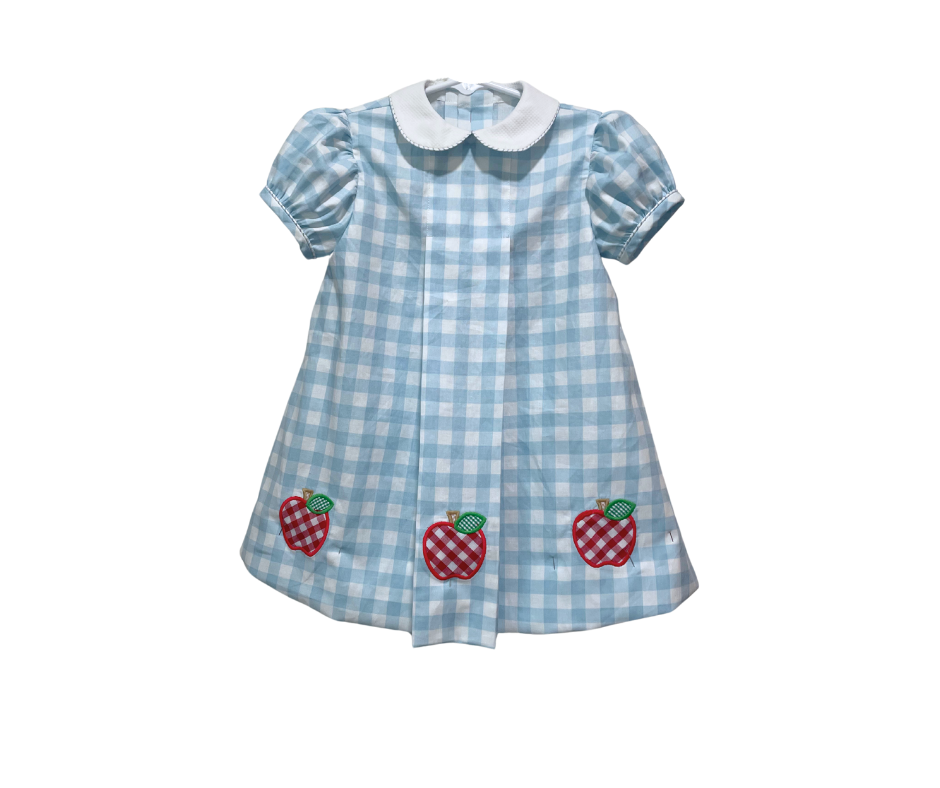 Sky blue gingham with cheerful red apples and a white pique collar with wrapped piping on the collar and sleeve bands—this dress is as sweet as the little one wearing it. Perfect for back to school or fall photos. Includes matching bloomers.