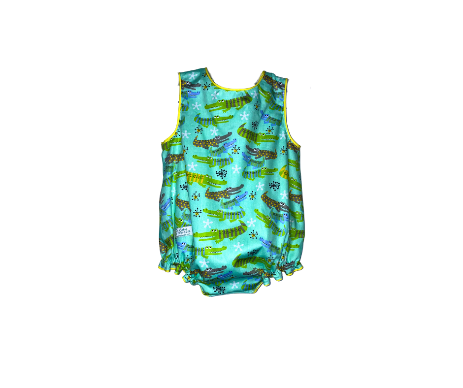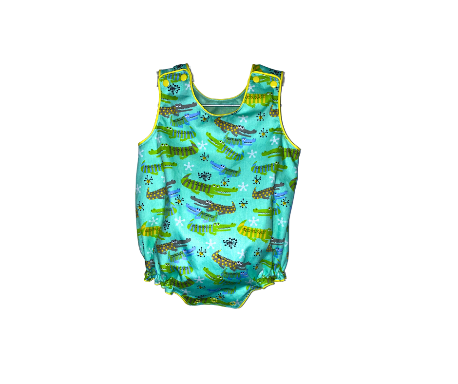 Get ready for fun in the sun with our Gator Days Romper! This cheerful one-piece is splashed with playful alligators on a turquoise background, bringing a pop of personality to your little one’s summer wardrobe. Yellow piping along the shoulders and legs adds the perfect finishing touch for a crisp, polished look.