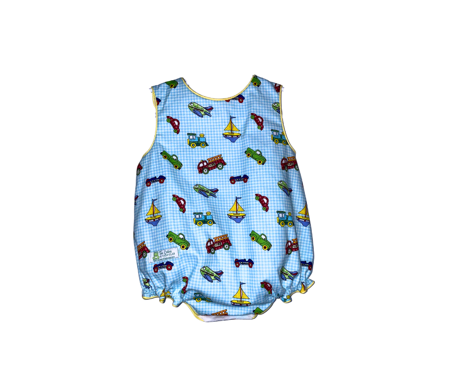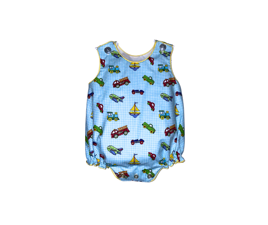 Vroom, zoom, and cruise into cuteness with our Little Wheels & Whimsy Bubble Romper! This precious romper is bursting with personality thanks to its playful print featuring colorful cars, trucks, boats, and planes on a soft blue gingham backdrop.