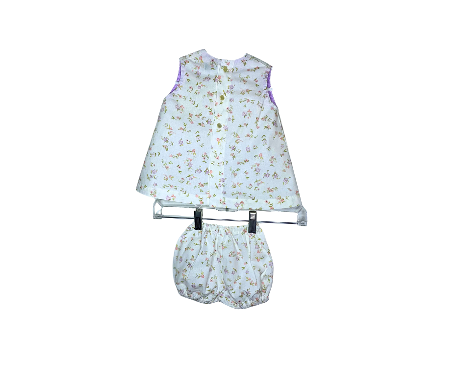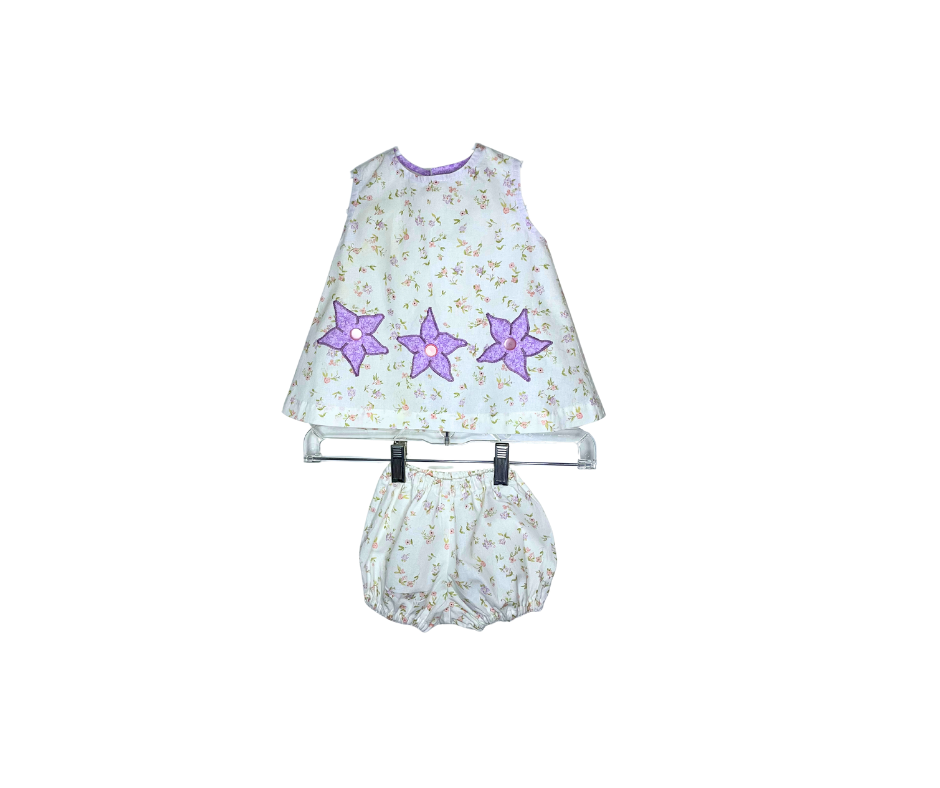 Delightfully sweet and playfully charming, our Purple Petal Play Set is the perfect pick for your little one’s summer adventures. This two-piece outfit features a breezy A-line, diaper shirt adorned with three lavender flower appliqués and soft floral print, paired with matching bloomers for a complete, coordinated look.