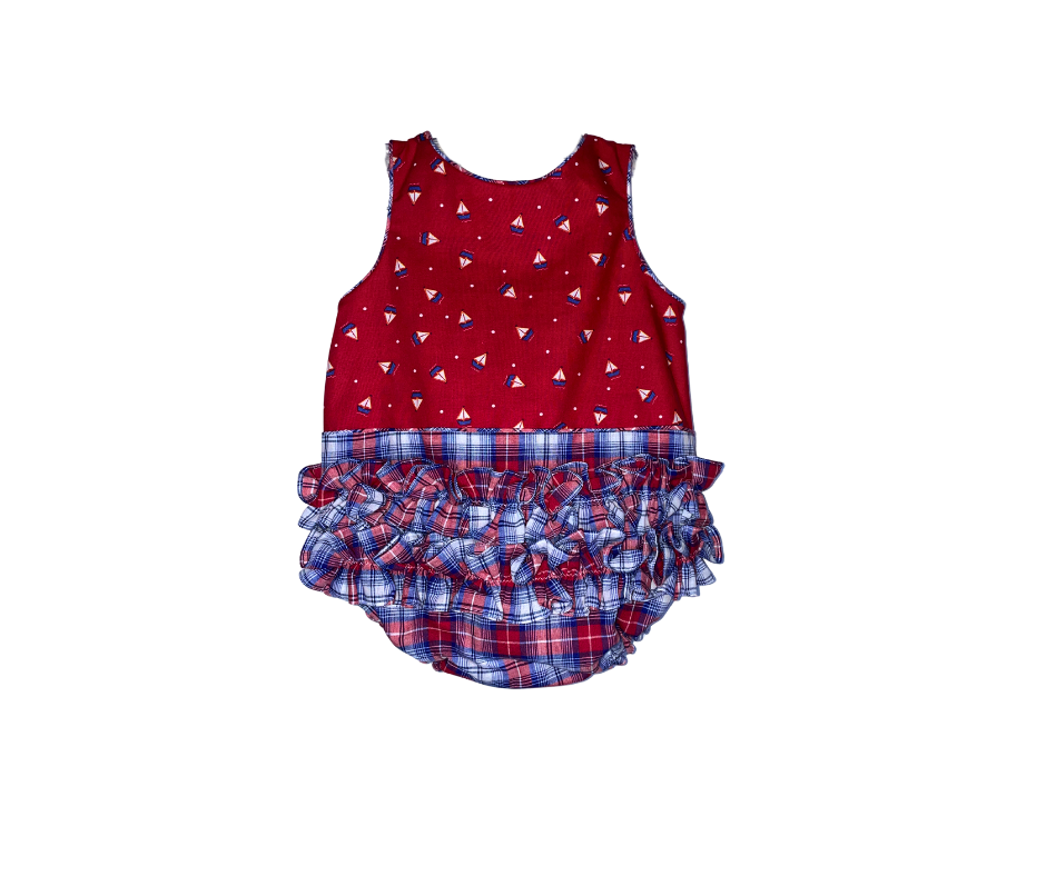 Set sail in sweet southern style with our Sailboat Plaid Bubble! This nautical-inspired romper features a vibrant red bodice with adorable sailboat embroidery and matching mini sailboat print, perfectly paired with a soft, red and blue plaid bubble bottom. Ruffled leg openings add a darling touch, while buttons at the shoulders ensure easy dressing.