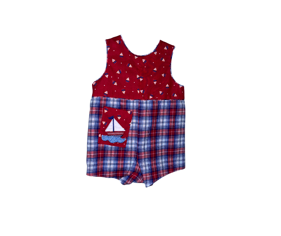 A sailboat appliqué on the front pocket adds a playful, nautical touch, while the snap closures at the shoulders and legs ensure easy changes. Meticulously handmade with comfort in mind, this romper is lightweight, breathable, and made to move with your little one—whether he's on the beach, at a backyard barbecue, or just cruising around the house.