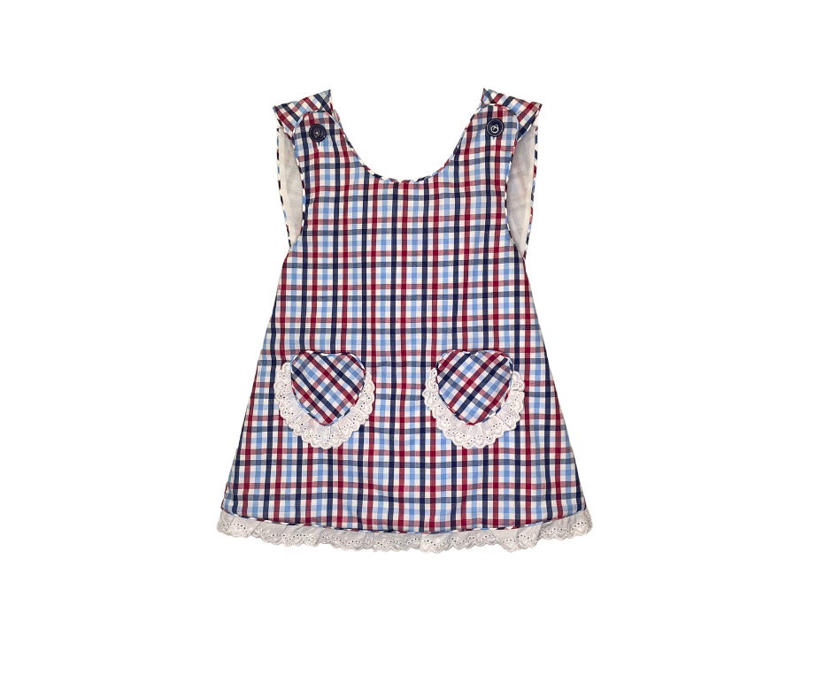 This red, white, and blue gingham set with heart-shaped lace-trimmed pockets and bloomers is a darling nod to vintage charm. Perfect for playdates, parades, and picnic days!